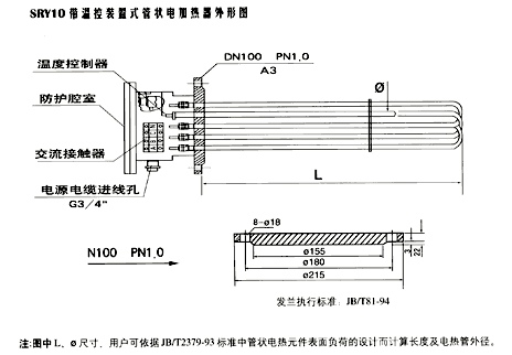 SRY10管狀電加熱器在接線腔內設有溫度控制器、交流接觸器,無需電熱控制箱,直接接通三相電源就可以使電加熱器工作,溫度達到所需要求自動切斷電源,溫度低于標準值,自動打開電源,也可以設計成帶圓管護套管式電加熱器,維修方便。